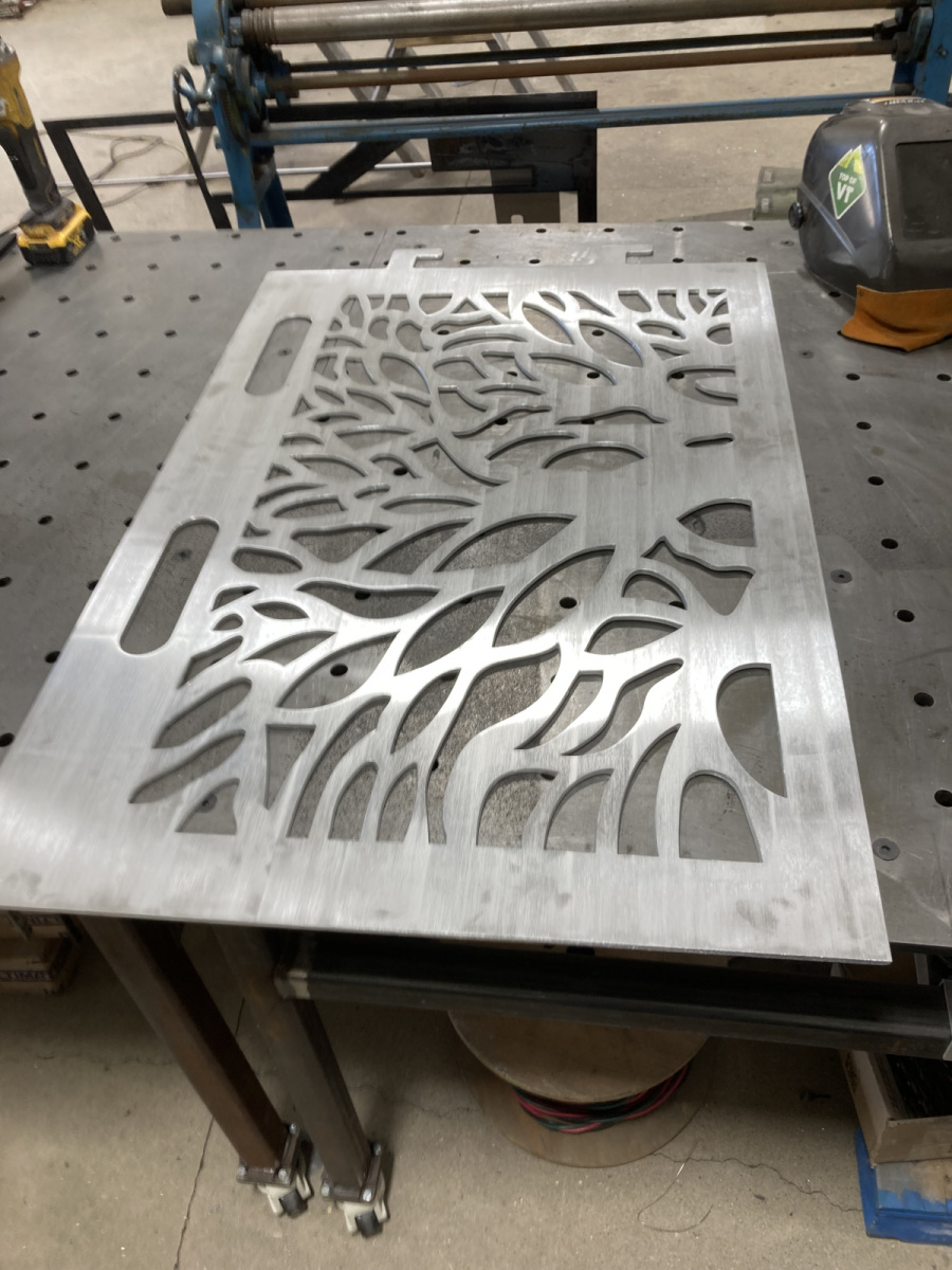 Wire brush finish with clear epoxy top coat.